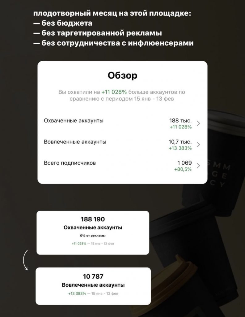 — рост подписчиков в локальном аккаунте + 1.100 человек в первый месяц работы